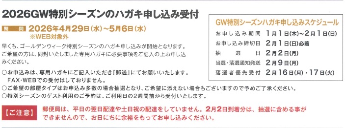 2026.01.042026年GW特別シーズン ハガキ申し込み受付開始 4月29日(水)~5月6日(水) ※WEB対象外